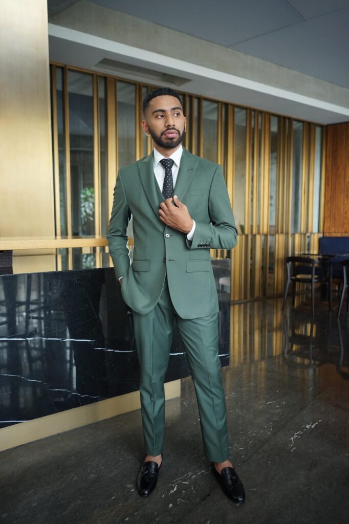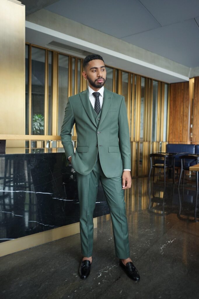 Tailored slim with jetted pockets and a natural shoulder, this Emerald Green is cut from a wool and cotton blend by Italy’s Rogna mill. Comes with a single breasted waistcoat.